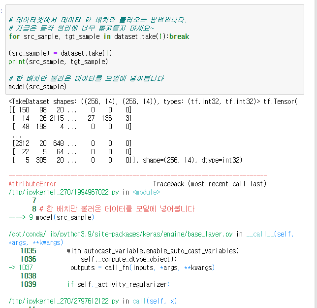 - for문을 읽어오자 마자 break를 한다. 그냥 src_sample, tgt_sample = dataset.take(1)하면 안되나?+ : (src_sample, tgt_sample) = dataset.take(1)도 해봤음. 위에거랑 같은 오류뜸.